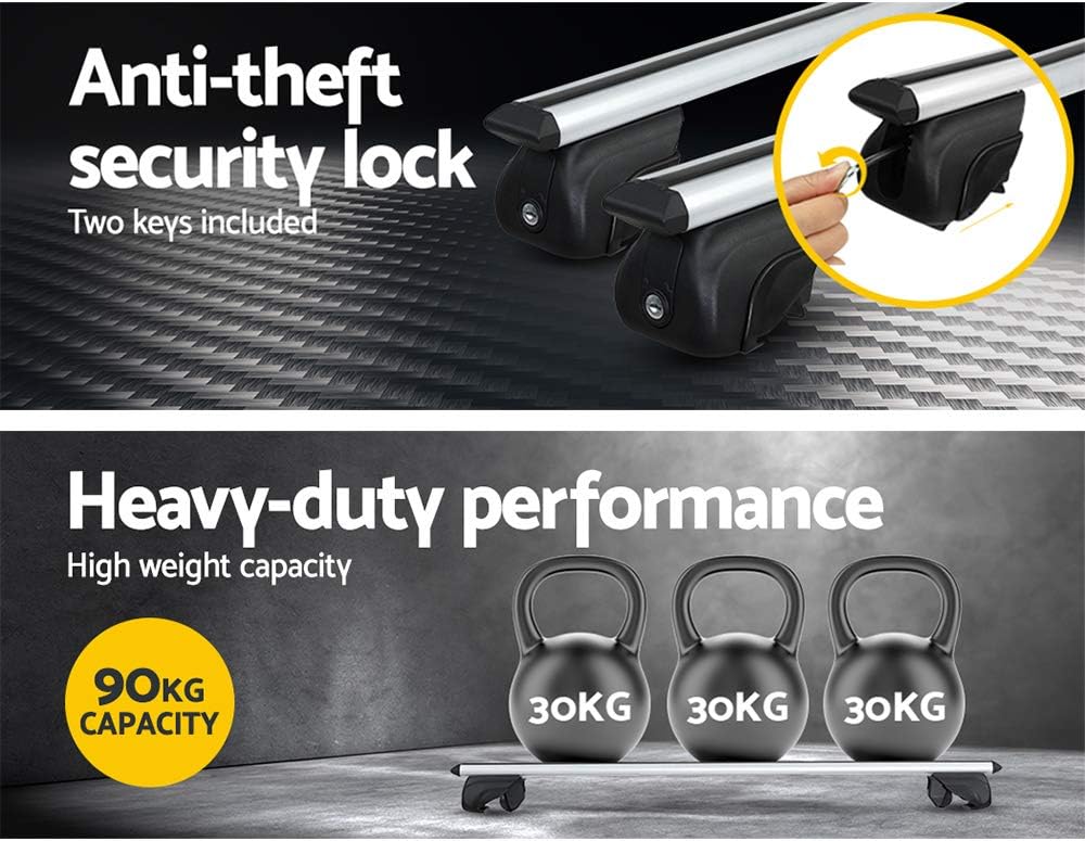 Wherever you want to go, whatever you want to bring, our Car Roof Rack is an extremely necessary piece to extend a car’s load-ability. Featuring a universal fitting design with an upgraded holder and an adjustable fitting width to fit raised roof rails up to 126cm (maximum fitting width) apart and minimum 20mm gaps between roof and rail, the rack is compatible with most medium-sized cars, SUVs, utes and canopies on the market. The specially engineered T-slot channel allows easy installation of roof rack accessories, with enhanced strength and low air resistance. With a specialised anti-theft security locking system with two independent keys included, this aerodynamic roof rack is ideal for long road trips and off-road adventure. Note: This product is primarily designed to work with longitudinal mounts and raised rails with a gap of a minimum of 20mm between roof and rails. *Not recommended for installing on rain gutters, integrated or solid roof rails. *Please check dimensions carefully before purchaseFeatures Aircraft-grade aluminium construction Anti-rust/corrosion Anti-theft security locking system - 2 keys included Elliptical shape to minimise wind resistance Adjustable width to fit various vehicles’ roof rails Suitable for most medium-sized cars, SUVs, utes and canopies with raised roof rails up to 126cm (maximum fitting width) Easy installation Specifications: Material: Aircraft-grade aluminium and plastic Loading capacity: Up to 90kg Maximum fitting width: 1260mm Dimensions: 139cm x 9.2cm x 12cm Net weight: 3.65kg Colour: Silver Assembly required: Yes Package Content Car Roof Rack 1260mm x2 Mounting Holder x4 End cap x 4 (set) Key x 2 Allen Key x1 User Manual x1