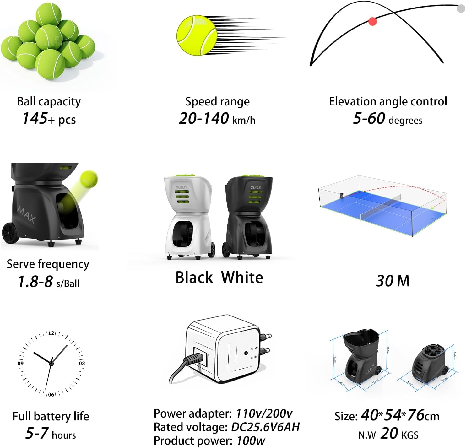 I. Product Parameters Product Title: PUSUN PT-SMART PRO Padel Portable Tennis Ball Machine for Outdoor Sports Brand: PUSUN Model: PT-SMART PRO Padel Battery Life: 5-8 hours of continuous play Control Options: App/Remote Control Serve Frequency: Adjustable between 1.8 – 8 seconds Speed Range: 20 – 120 km/h for versatile practice Serving Distance: Up to 30 meters Elevation Angle: 5° – 45° for varied shot trajectories Keywords: Tennis Ball Machine, Portable Padel Ball Machine II. Product Selling Points Extended Play Time: A robust battery life (5-8 hours) ensures prolonged training sessions without interruptions. Smart Connectivity: Seamlessly control the machine via a dedicated mobile app, remote, or even your , making adjustments quick and hassle-free. Customizable Training: With an adjustable serve frequency (1.8-8 seconds) and speed settings (20-120 km/h), players can tailor sessions to match their skill level and training needs. Versatile Performance: The ability to serve at various distances (up to 30 meters) and elevations (5-45°) replicates real-game conditions, enhancing accuracy and shot control. Portability & Durability: Designed for outdoor sports, this lightweight yet durable machine is perfect for on-the-go practice, whether you’re training at a local club or on a public court. Comprehensive Skill Development: Ideal for beginners, training sessions, club practice, and even professional competitions, offering an all-in-one solution to elevate your game. III. Usage Scenarios Beginner Training: Perfect for players starting out; the adjustable settings allow novices to gradually improve their timing, speed, and shot accuracy. Club & Team Practice: Enhance training routines at clubs or sports facilities with consistent, reliable serves that mimic real match conditions. Pro-Level Preparation: Professionals can fine-tune specific aspects of their game by varying serve speeds and angles, simulating high-pressure scenarios on the court. Outdoor Recreation: Whether in your backyard, at a community court, or during a club event, this portable machine offers convenience and high performance for a wide range of outdoor sports activities. Personal Coaching: A great tool for personal trainers and coaches, enabling customized drills that focus on improving reaction time, agility, and overall technique.