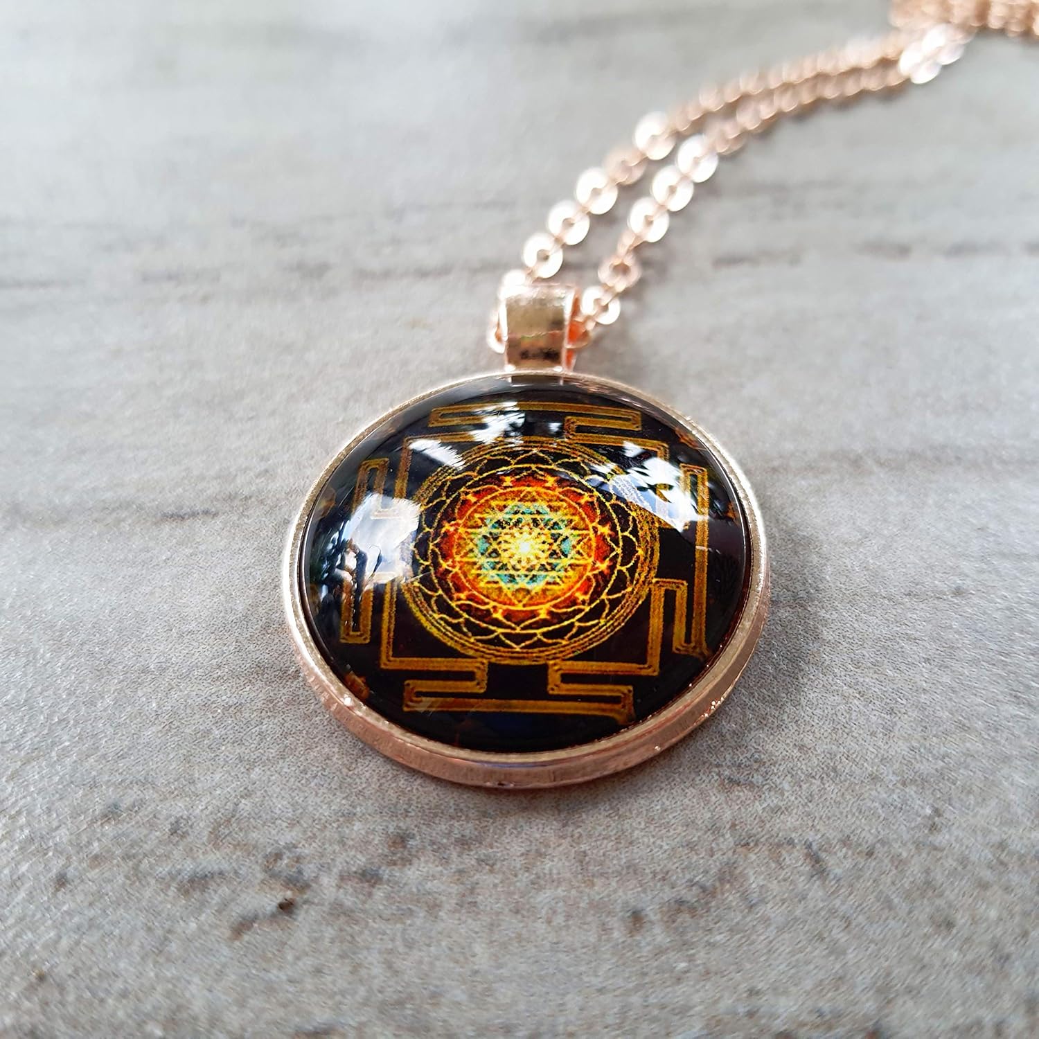 Sri Yantra sacred geometry necklace . Creates material abundance in your life. Sri Yantra has an extraordinary power to fulfill all your wishes and change your life forever. The Sri Yantra benefits and powers should help us to fulfill our desires and make our lives better. It is meant to bring us wealth, both in the spiritual and material realm. It should also bring peace, strength, and success to the user. The motive should help to remove obstacles in life and remove bad influences.